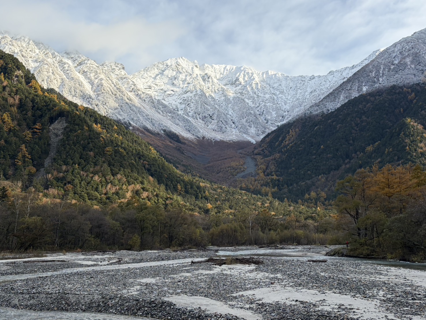 本当は「涸沢の紅葉」=雄大に色鮮やかさカールを埋め尽くす山岳紅葉の代名詞を今年こそ味わおうと計画していたのですが、あいにく10月の連休の天候不良から断念し、せめて上高地の紅葉とまずは途中の横尾まで涸沢行偵察という名目で、平坦な山道ながらの往復25㌔、往復8時間・約40000歩を歩いてきました。